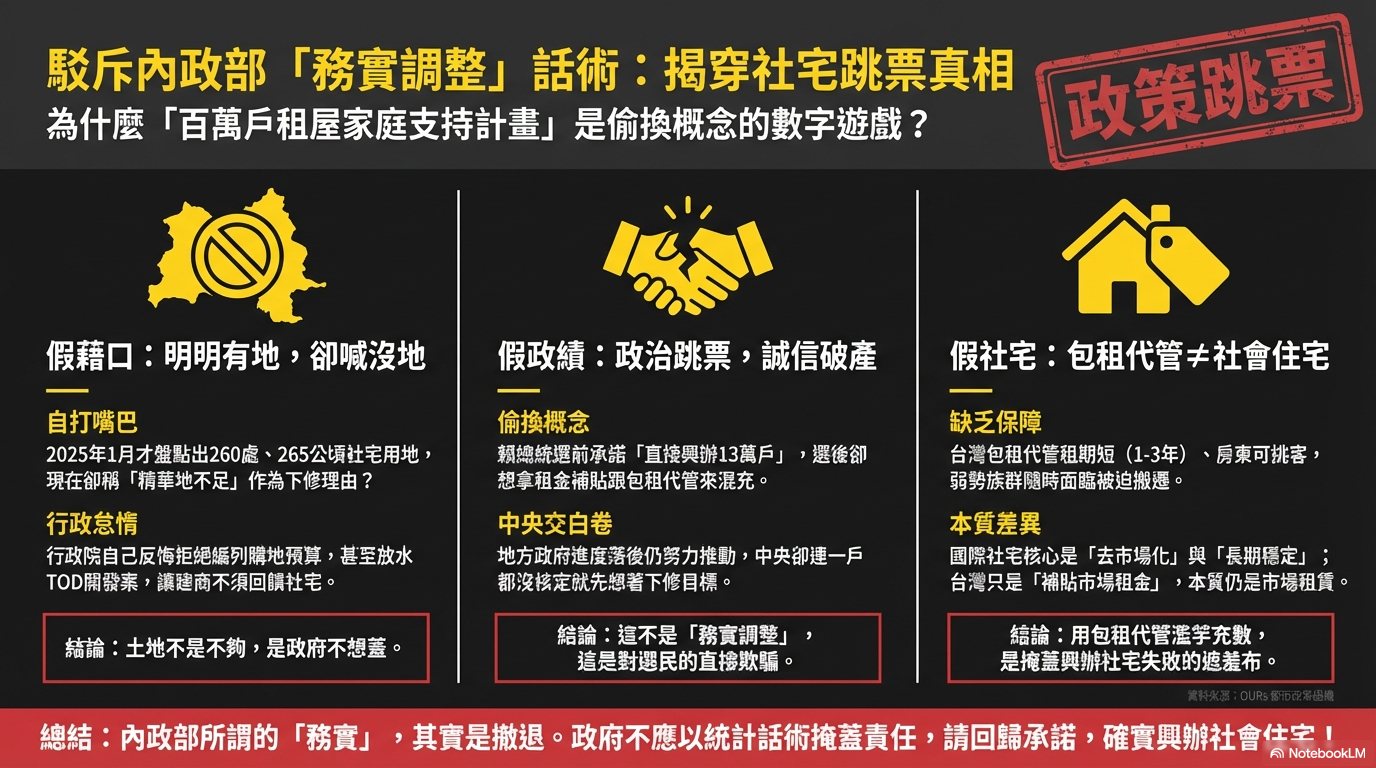 前日(1/19)立法院內政委員會就「賴清德總統興建 13 萬戶社會住宅政策無法落 實」進行專案報告,但內政部通篇以「三軌合計 100 萬戶」作為政策主軸,刻意模糊租金補貼、包租代管與直接興辦社宅的本質差異。