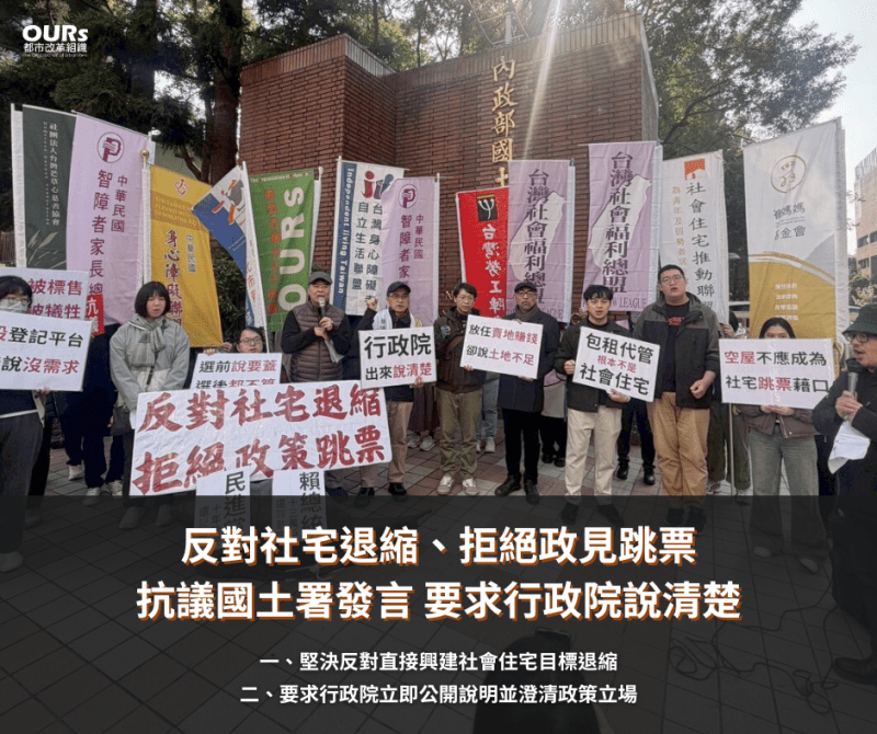 因此,今天(1/13),社會住宅推動聯盟共11個團體齊聚國土署前抗議,嚴正要求行政院出面說清楚:這究竟是署長個人發言,還是政府政策已經正式轉彎?