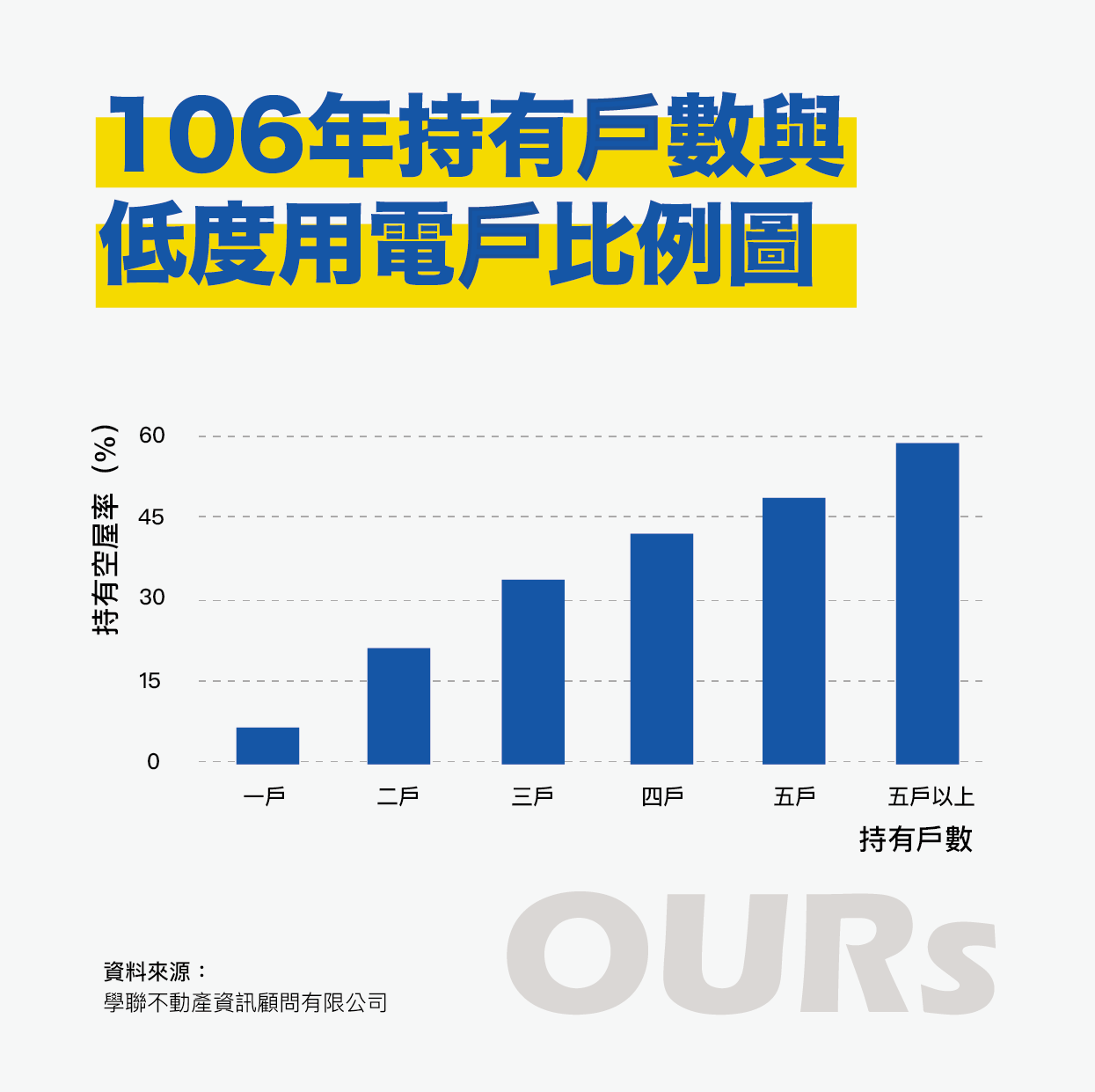 另依據2017年財政部的住宅歸戶資料,台灣擁有四屋(含以上)之家戶,約32萬,共持有約162萬間房屋;如再計入擁有三屋者,則達297萬間,佔(個人持有)住宅存量的37.6%。若與同年低度用電戶資料比對勾稽,將赫然發現: