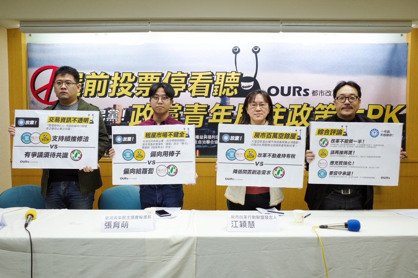 OURs等團體於11月24日舉辦了《青年安居政策論壇》,邀請各政黨說明其青年居住政策主張。眼看大選投票日將屆,召開記者會,除將各黨回應全面整理公開,並公布對民進黨、國民黨、時代力量、親民黨、台灣民眾黨的青年居住政策評比(完整內容詳附件),作為媒體各界與公眾之參考指南。