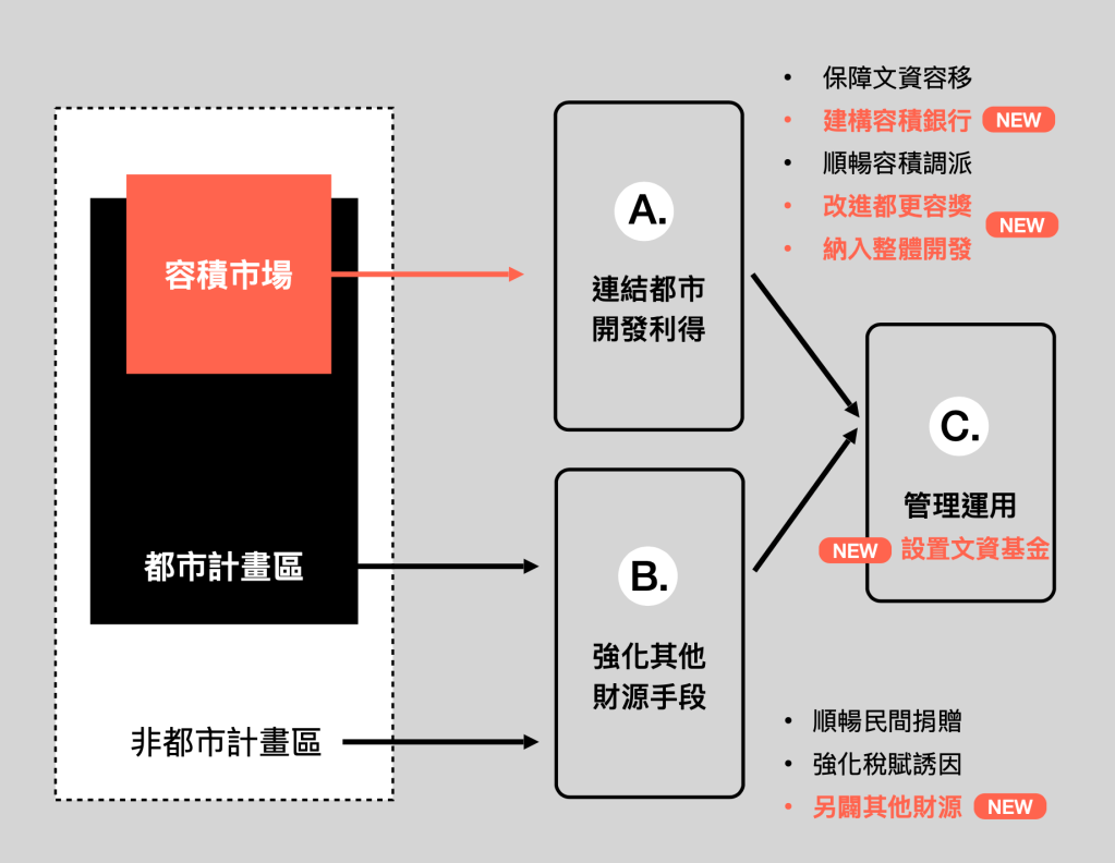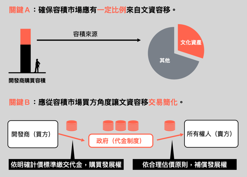另一方面,從容積市場「買方角度」,應簡化文資容積交易成本、提升購買誘因,建議方案為「容積代金」制度,能讓開發商依明確的計價標準,繳交代金給政府購買發展權,再由政府將代金經估價後給予文化資產所有權人作為補償。