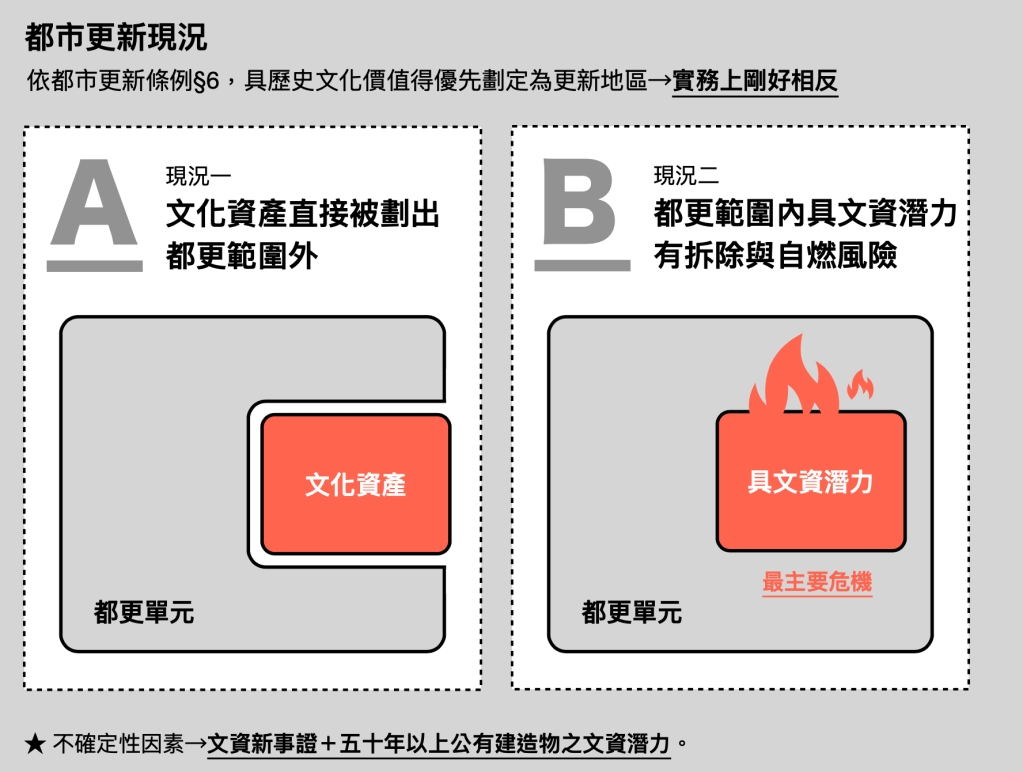 文化資產運用都市更新容積獎勵的癥結點為:現行都市更新獎勵制度,缺乏將文資或具文資潛力建物納入更新範圍誘因,致使相關所有權人無法參與分享都市更新利益分配,進而衍生遭拆除或自燃等爭議。
