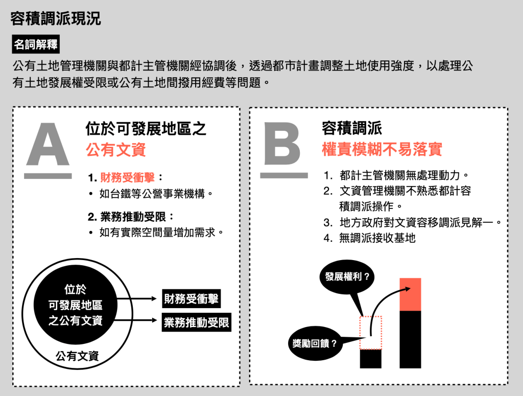 公有文資「容積調派」即透過都市計劃調整土地使用的強度,把受限容積移去他處。然實務上地方政府未必配合辦理都市計劃,或對容積調派的見解不一要求管理機關在調派時需提供回饋等。針對此一情形,則建議文化部修訂《文化資產保存法》,賦予管理機關容積調派請求權,因容積調派是一種發展權的使用而非獎勵,應讓管理機關有主動發動權並統一見解,讓既有發展權利的移轉無需再提供回饋。