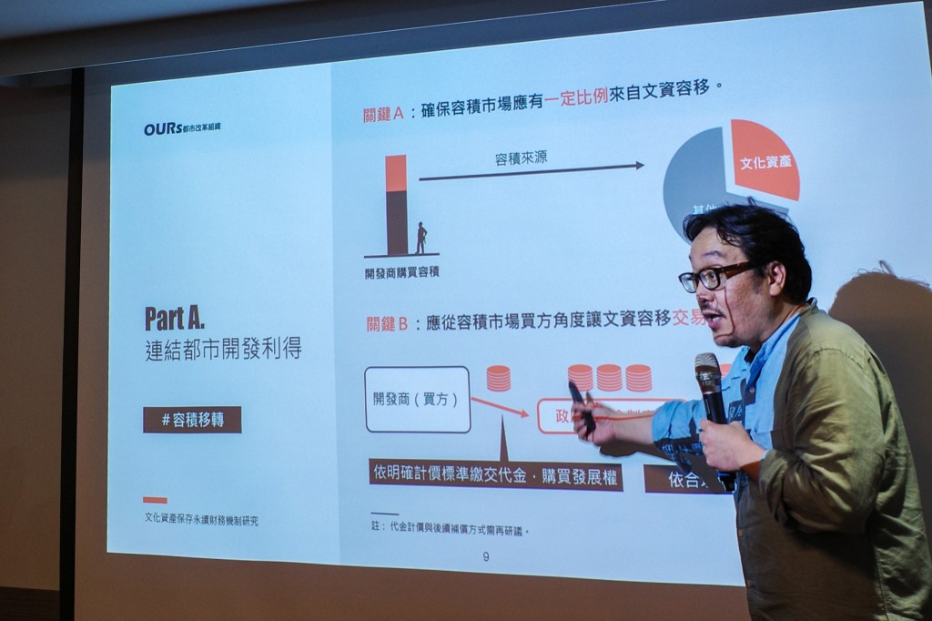 從財務的角度來看,陳登欽則認為在預算不足的情況下,應該想如何擴大「市場」,如同OURs所提的策略,如何替文資容積找出路,確保承受基地裡面一部分一定要來自文化資產的容積移轉,減少開放公共設施保留地移轉後產生的排擠效果,才能有效解決問題。