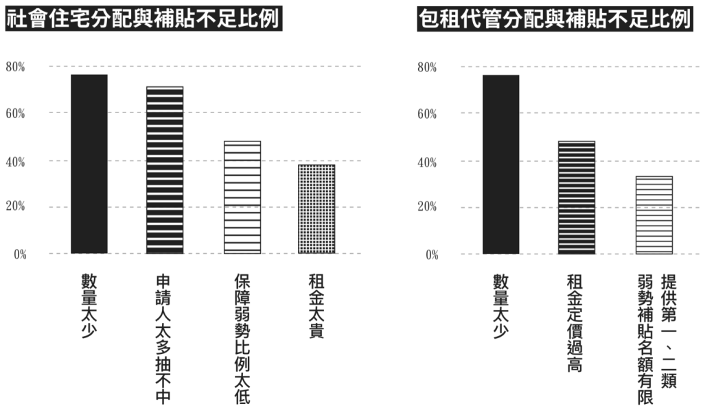 數量不夠是社會住宅(78.3%)與包租代管(76.9%)最主要的問題。除了客觀數量不足外,弱勢分配比例過低,包括社會住宅保障弱勢比例30%過低(46.8%),包租代管提供一、二類補貼名額有限(34.1%)等問題,甚至有近半社工反映包租代管業者會挑選對象(48.7%)。