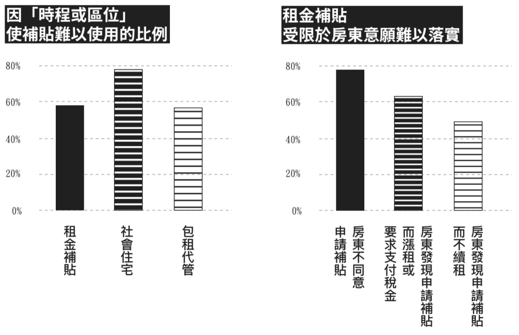 另一原因是租屋市場弊端。弱勢者欲申請租金補貼,極可能面對房東不同意申請租金補貼(78.6%),房東發現個案申請補貼而漲租或要求支付稅金(62.5%)。