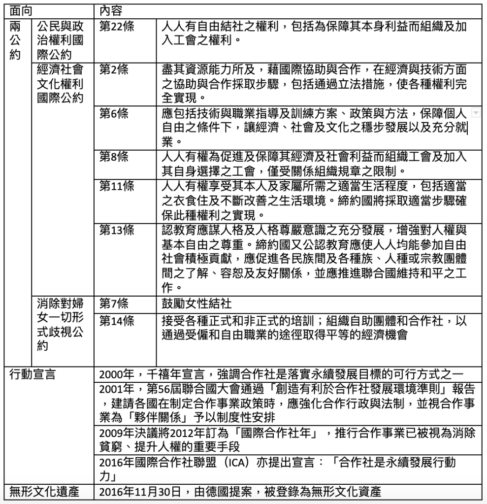 - 兩公約:合作經濟乃人民之結社經濟人權,依《公政公約》第22條、《經社文公約》第2、6、8、11、13條,政府應積極履行;《消除對婦女一切形式歧視公約》第7、14條肯認合作社是實現性別平權的重要一環。