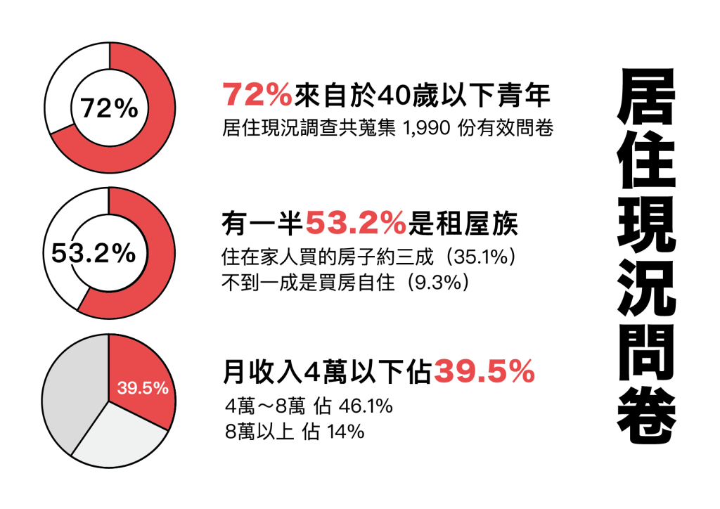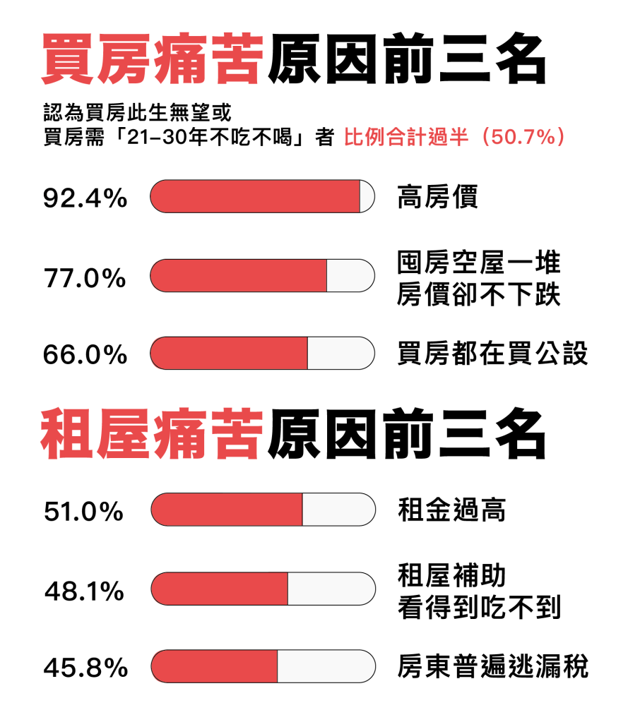 透過上述調查,我們可大致描繪以青年為主民眾的居住痛苦為:在高房價情境下,既使已達一定收入,仍對購屋感到困難乃至絕望,同時對囤房空屋現象深感不公,又即便勉強購屋也憂慮公設灌水問題。另一方面,採租屋解決居住需求,則是苦於租金上漲與租屋黑市(房東普遍逃漏稅),租屋權益(抵稅、設籍、糾紛)缺乏保障,政府補貼美意也常看得到吃不到。