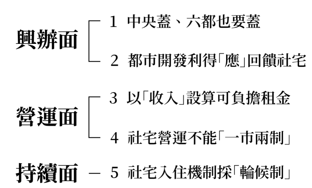 面對社會住宅的「興辦面」、「營運面」、「持續面」三大挑戰,住盟提出了「五大社宅政策訴求」對應解決: