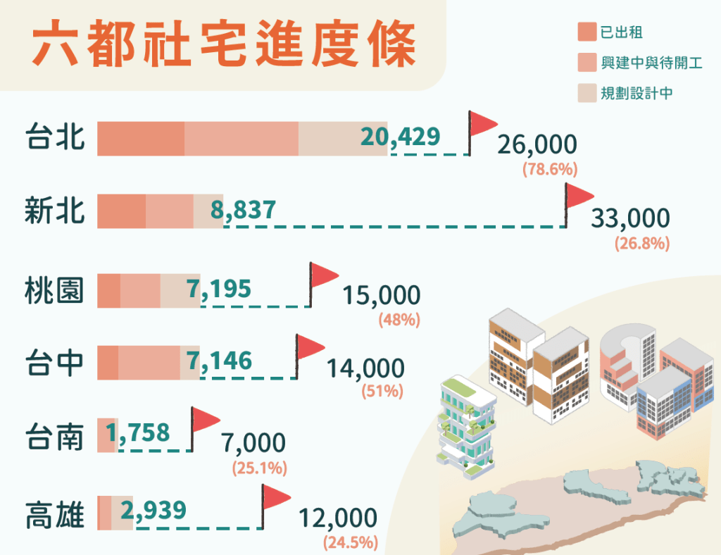 根據住盟統計(註1),目前即便加上「規劃設計中」的數量,六都至今也僅完成 48,304 戶社宅,若再考量多數仍處興建或規劃階段,對應於中央「12萬戶」就六都的目標規劃,仍相差甚遠。