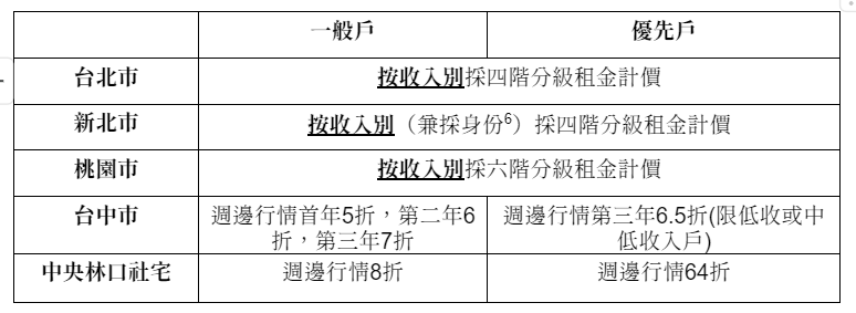 註6:新北市採「收入為主,身分為輔」的計價方式。其中更便宜的「第1階」與「第2階」租金,除考量收入外,另需具備《住宅法》第四條之經濟或社會弱勢身分。