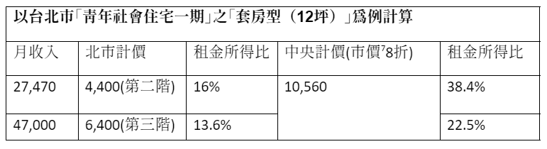 以台北市萬華區「青年社會住宅一期」之「套房型(12坪)」計算租金為例,若青年A收入為27,470(基本工資),青年B收入為47,000,在都沒有弱勢身份的狀況下,採台北市現制「收入分級收費」標準與內政部「身份別市價打折」租金變動,很明顯對收入較低的青年A租金負擔明顯加重。