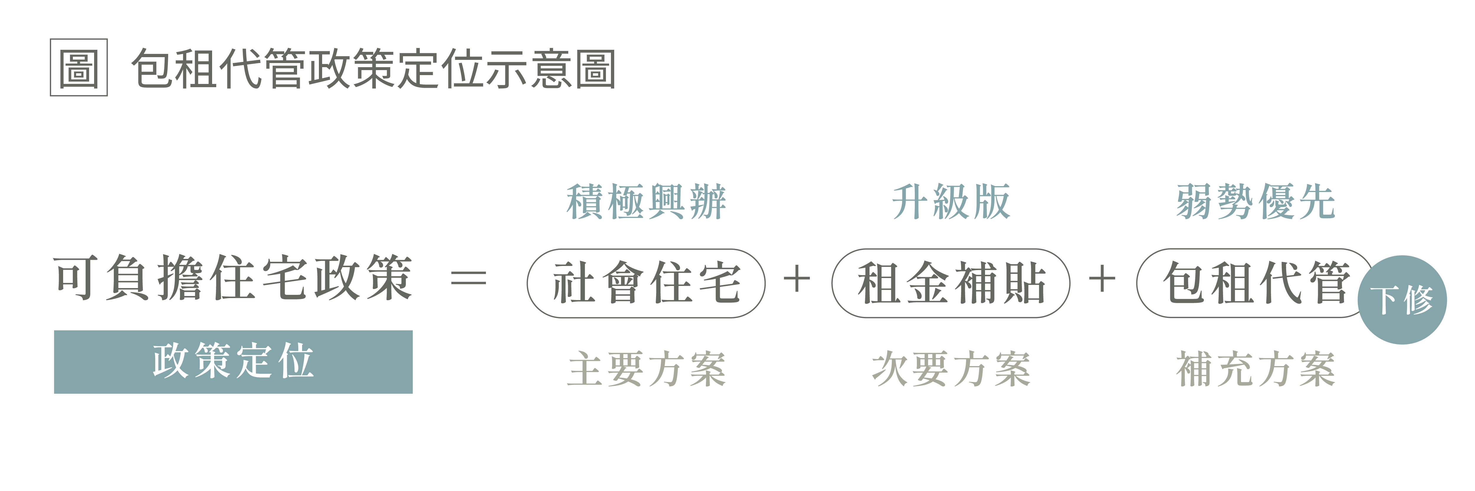應重新定位包租代管政策,分流「包租」與「代管」機制,前者回歸「弱勢居住協助」初衷,後者則逐步轉軌至租金補貼。