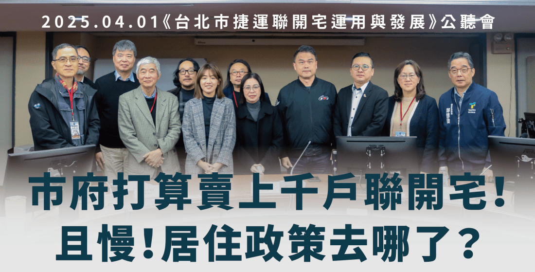 鑑於此議題涉及捷運局、都發局乃至財政局之跨局處業務,我們呼籲蔣市長應積極面對,從城市治理的高度,整合交通與住宅政策,讓交通建設不只是硬體工程,捷運聯開也不再只有賣屋賺錢,更能成為落實居住正義的槓桿。