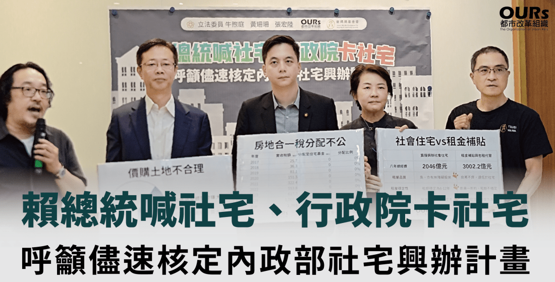 針對此,OURs都市改革組織、崔媽媽基金會等民團今日(6/6)特召開記者會,並邀請國民黨牛煦庭委員、民進黨張宏陸委員、民眾黨黃珊珊委員等跨黨派委員出席,呼籲行政院別拖賴總統後腿,應盡速核定內政部提出的13萬戶社宅興辦計畫,落實25萬戶社宅政見承諾。