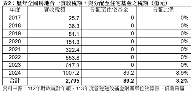 註2: 2014年房地合一稅研擬期間,財政部表示房地合一稅應提撥20%做為住宅基金收入,但並未落實。直至房地合一稅上路8年後(2024年),方首次分配住宅基金10%稅額;隔年因升息導至補貼額度攀升(與社宅無關)再將分配額提升至20%。