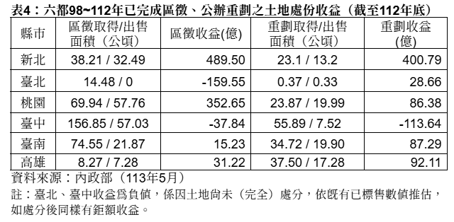 其次是「節流」面,在113年至121年的社宅計畫中,「價購整體開發地區用地」(註3)預計將花費801.3億元,是最大筆的支出項目,佔總支出近四成(表3)。問題是,為何要用價購?地方政府、特別是六都,透過標售整體開發取得的土地,皆取得鉅額的盈餘。依98~112年統計數據,六都透過區徵、公辦重劃合計取得約 537 公頃土地,截至112年累計僅標售其中47%,扣除開發成本後已有超過 1,500 億元的收益(表4)。在這種狀況下,中央掏錢蓋社宅幫六都解決居住問題,卻還要再編列預算來購買地方的土地才能做,這樣合理嗎?特別是在財政劃分法修法之後,六都財政收入明顯提高,理應承擔更多的責任。