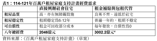 從財務角度比較,社宅要先投資建物,若妥善管理使用年限可達五十年以上,期間租金收入可回收部分成本,其餘透過補貼;反觀「租金補貼」、「包租代管」 則屬連續性現金補貼,隨著時間推進,補貼金額也水漲船高,以五十年來看,累積支出將大於社宅補貼,且什麼都沒留下。 兩者在財務性質上皆屬「非自償」支出,為何前者被卡關、後者卻沒有問題 (表1)?