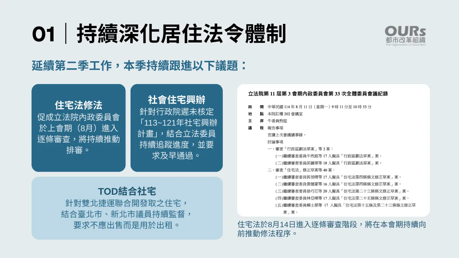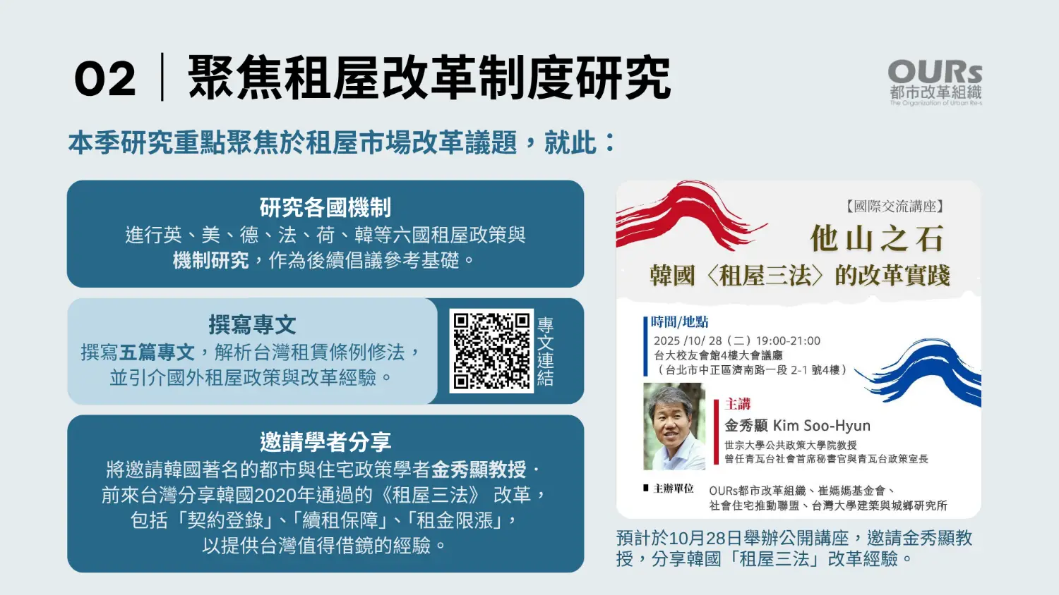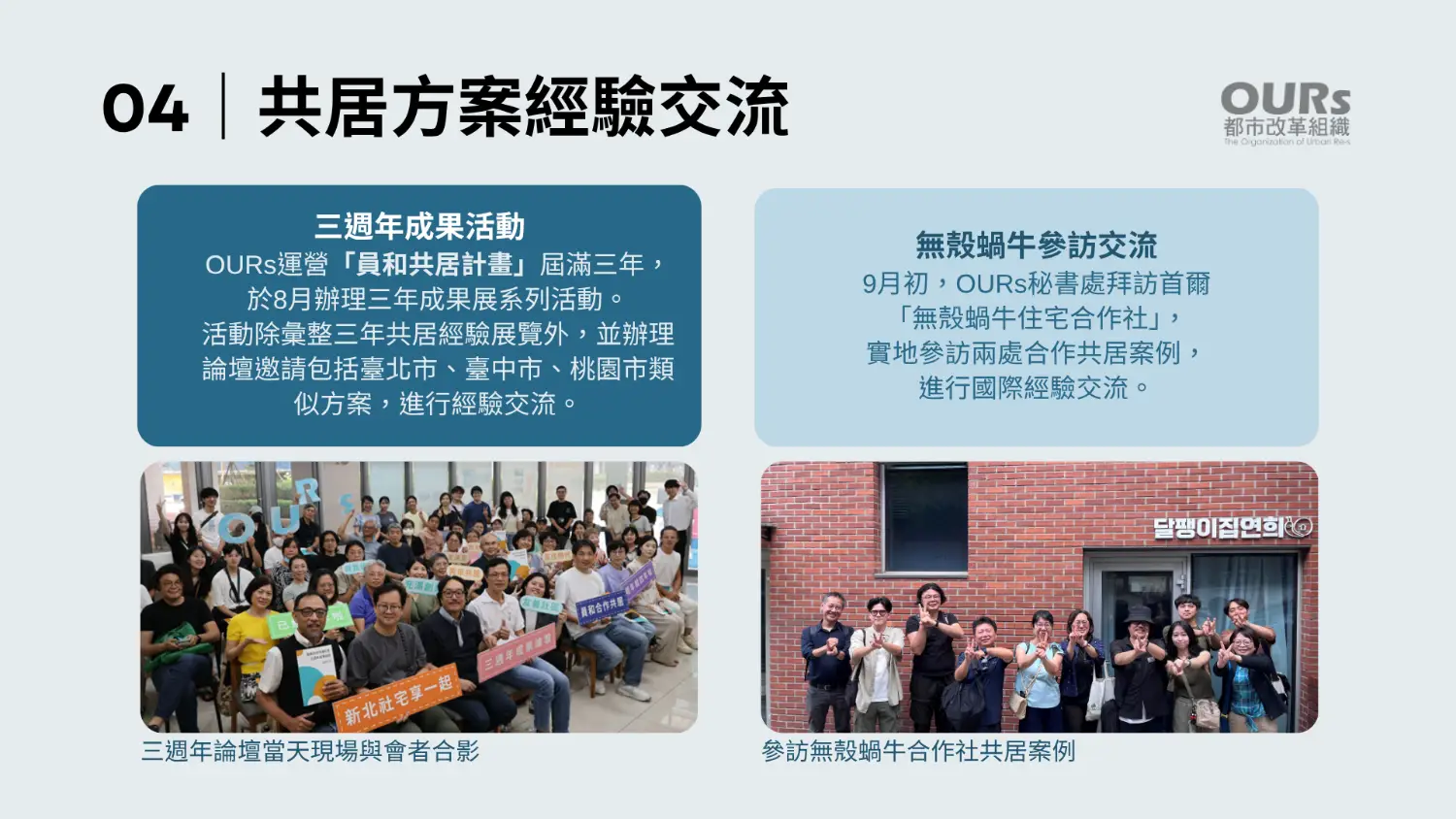 2025年第三季工作報告,OURs整理了今年7至9月的重點成果;從推動住宅法修法、租賃制度改革,到共居經驗交流與公共倡議,代表我們對社會信任的回應與承諾: