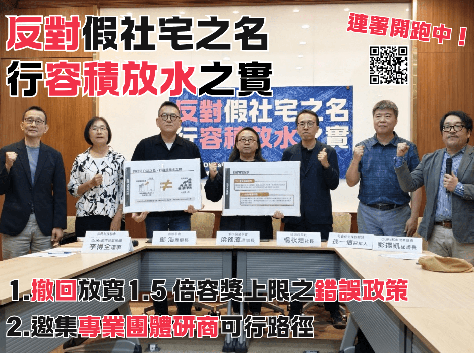 此項重大政策變動,表面以推動社宅為號召,實質上卻是通案性地鬆動都市環境承載與空間治理原則,將導致都市計畫法治瓦解、環境容受超載並反噬都更推動進度,亦難有效增加社宅取得。準此,OURs都市改革組織、都市設計學會、景觀學會、建築改革社、社會住宅推動聯盟、公民幫推等空間專業團體,共同召開記者會,呼籲政府撤回錯誤修法。