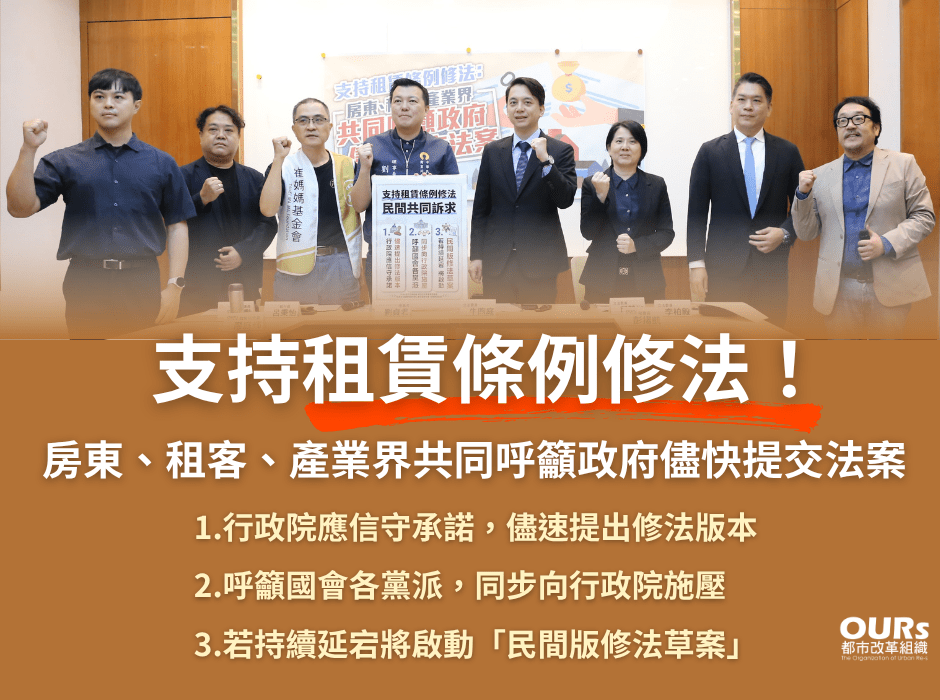 鑑於此,OURs都市改革組織、租賃住宅房東服務總會、租賃住宅服務商業同業公會全國聯合會、崔媽媽基金會等橫跨租賃市場供需兩端的民間團體,特與國民黨牛煦庭委員、民進黨李柏毅委員、民眾黨邱慧洳委員共同召開跨黨派記者會,呼籲行政院應儘速提出修法版本,以回應社會期待。
