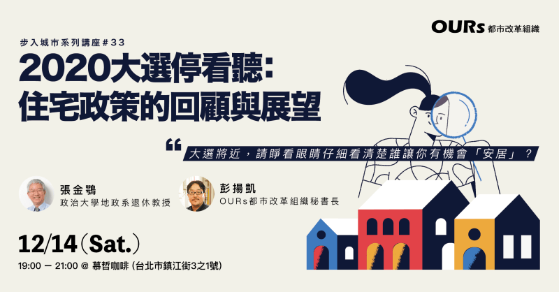 2020大選將近,OURs都市改革組織年底前最後一場步入城市講座,將從長期參與住宅政策倡議的學界與民間角度,回顧過去四年的住宅政策執行現況,分析當前政治情勢,並展望未來住宅政策的倡議方向!