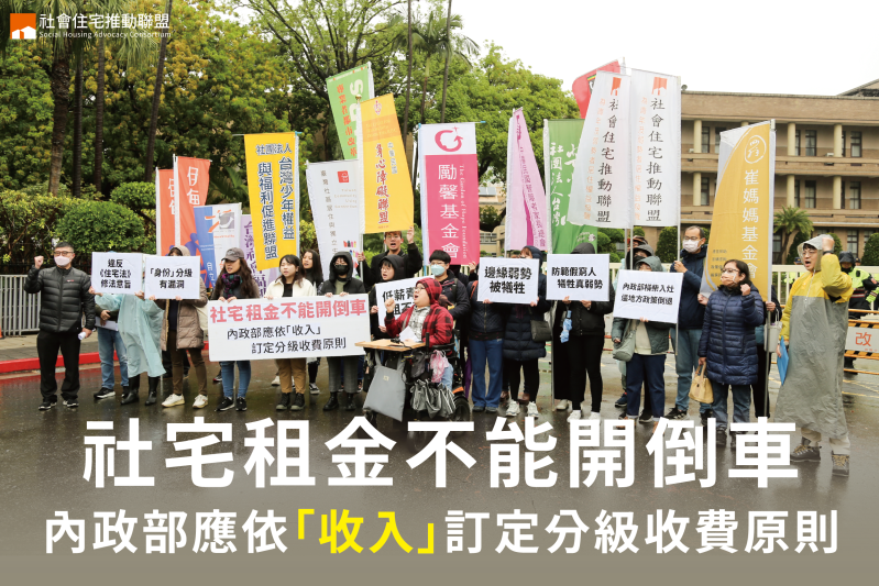 住盟無法接受內政部這種不公平、不合理、不合法的社宅「分級收費原則」,於3/19行政院前召開抗議行動,要求行政院制止內政部的顢頇鴨霸作法,應依「收入」訂定社宅分級收費原則。