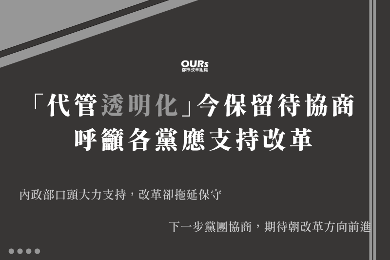 本次修法僅審查牛煦庭委員版本,其內容為將「代管」業者目前依法須每月提供予主管機關的租賃資訊公開透明,並將原有「包租」業者重複登錄的負擔免除,統一由政府逕行登錄。OURs強調,此法案內容已兼顧內政部所言「階段性改革」與「促進租屋透明化」之共同目標。OURs也對內政部長年「口頭大力支持、改革拖延保守」深感失望與遺憾,呼籲黨團協商時各黨均能就此法案取得共識,以盡速通過並正式上路實施,朝租屋透明化目標再邁一步。