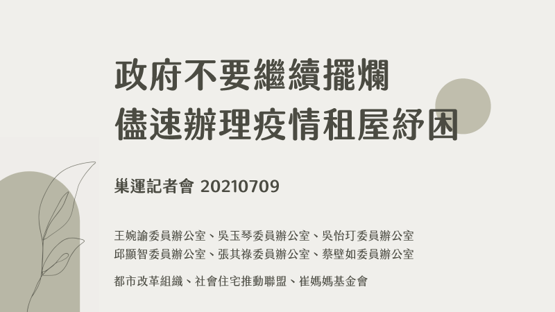 疫情對弱勢租屋階層的確有重大衝擊,而內政部的「加強租金補貼辦理」效果有限。就此再次召開記者會,正告政府不當持續擺爛,應即刻啟動租屋紓困相關作為。