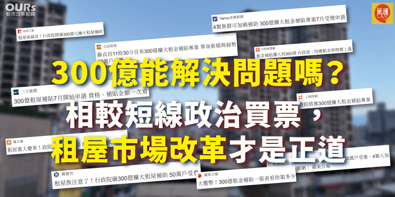 今(31)日行政院宣布「300億元中央擴大租金補貼專案」,並透過放寬所得標準等方式,將補貼戶數從今年的12萬戶一舉提升至50萬戶,號稱「經濟成長果實要與全民共享」。